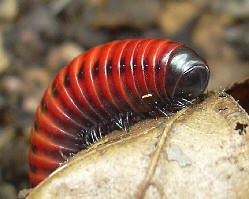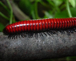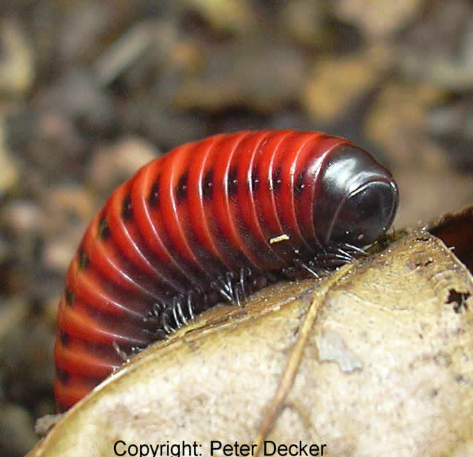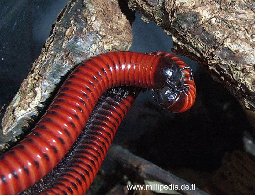 Beschreibung: Sehr schöne kleinere Art. Grundfarbe ist ein dunkleres rot. Ab dem 6. Segment schwarze Punkte auf den Wehrdrüsenausgängen. Auf dem vorderen Abschnitt der Segmente (Prozonite befinden sich mehr oder weniger deutliche schwarze Flecken. Von der Basis der Beine befindet sich auf dem hinteren Abschnitt der Segmente (Metazonit) ein schwarzes Band, welches bis unterhalb der Wehrdrüsen reicht, in den hinteren Segmenten diese auch teilweise erreichen. Ein unscheinbares dunkles Band zieht sich von den Wehrdrüsen bis zu den Punkten am Rücken. Kopfschild schwarz, stellenweise dunkelrot marmoriert, mit einem roten Band am hinteren rand, vorne schmal rot gesäumt. Kopf, Beine und Antennen schwarz. Beine der Männchen mit Sohlenpolstern an Tarsus, bis auf die letzten 14 Beinpaare. Sohlenpolster bedecken kompletten Tarsus. Tibia verkürzt bei den ersten Beinpaaren. Scobina (2 runde Vertiefungen am Vordeerand der Prozoniten) vorhanden.