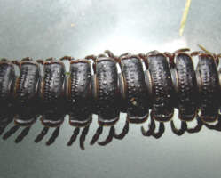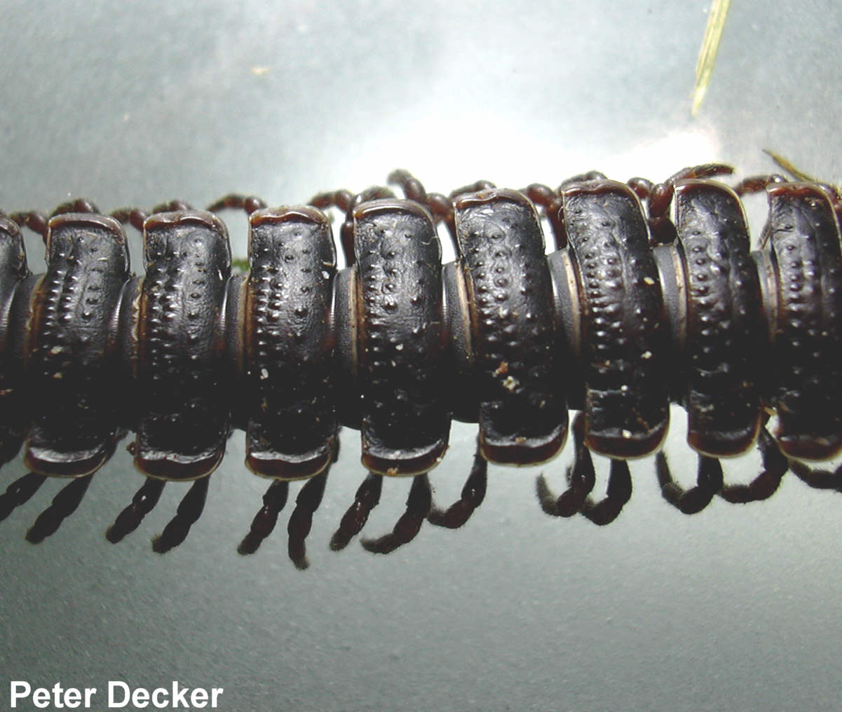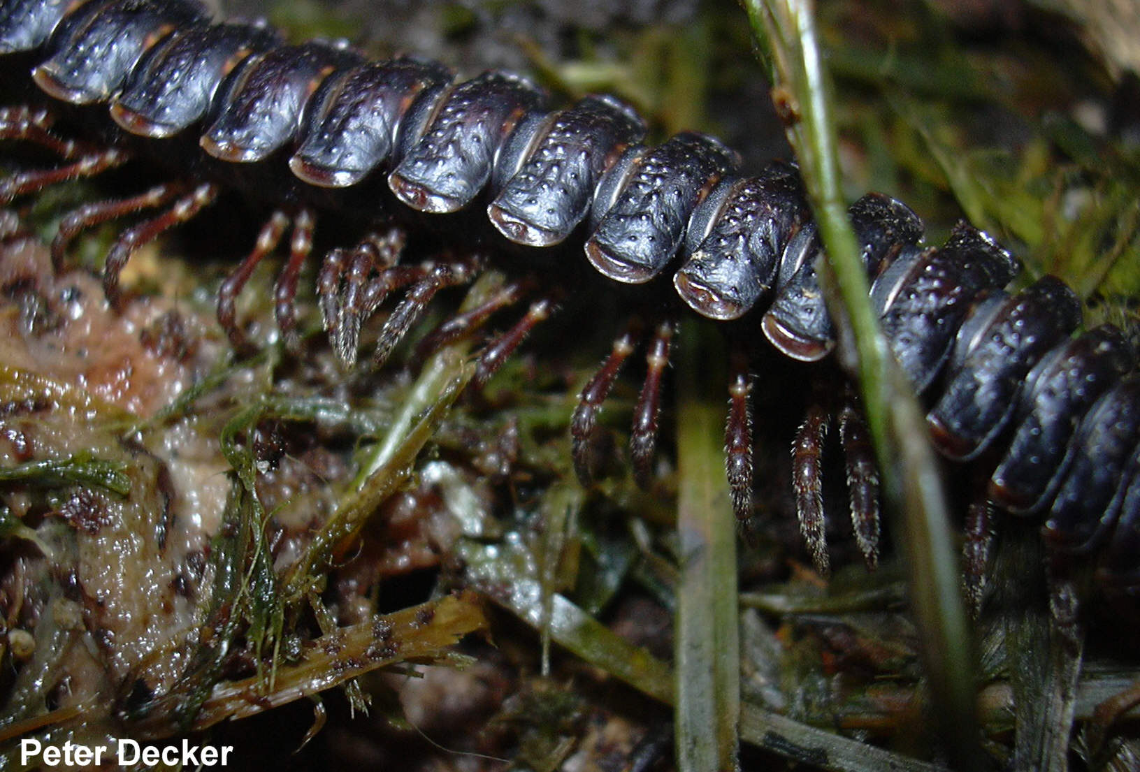 Beschreibung: Große Bandfüßerart mit mittelgroßen Seitenflügeln (Paranota). Grundfarbe matt dunkelrotbraun bis schwarz. Die seitlichen Ränder der Seitenflügel dunkelrotbraun. Am Vorderrand des Prozonit (vorderer Abschnitt der Segmente) zwei hellbraune längliche Flecken seitlich der Mittelinie. beine und Antennen dunkelbraun. Unterseite der Beine, sowei der Hintere Rand von Coxa und Prefemur hellbraun. Beine relativ lang und kräftig. Rückenschilde mit 3 Reihen kleiner Tuberkel. In der ersten Reihe 10, in der 2. und 3. Reihe 12 bis 16. In der Seite, oberhalb der Beine, befindet sich eine Reihe flacher, mit Spitzkegeln besetzten, Auftreibungen. Hinterrand der Metazonite (bis zu den Seitenflügeln) mit gelben langen Borsten.