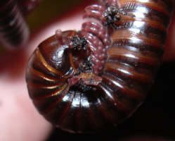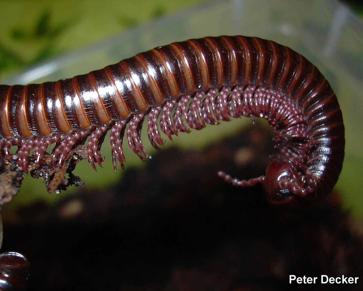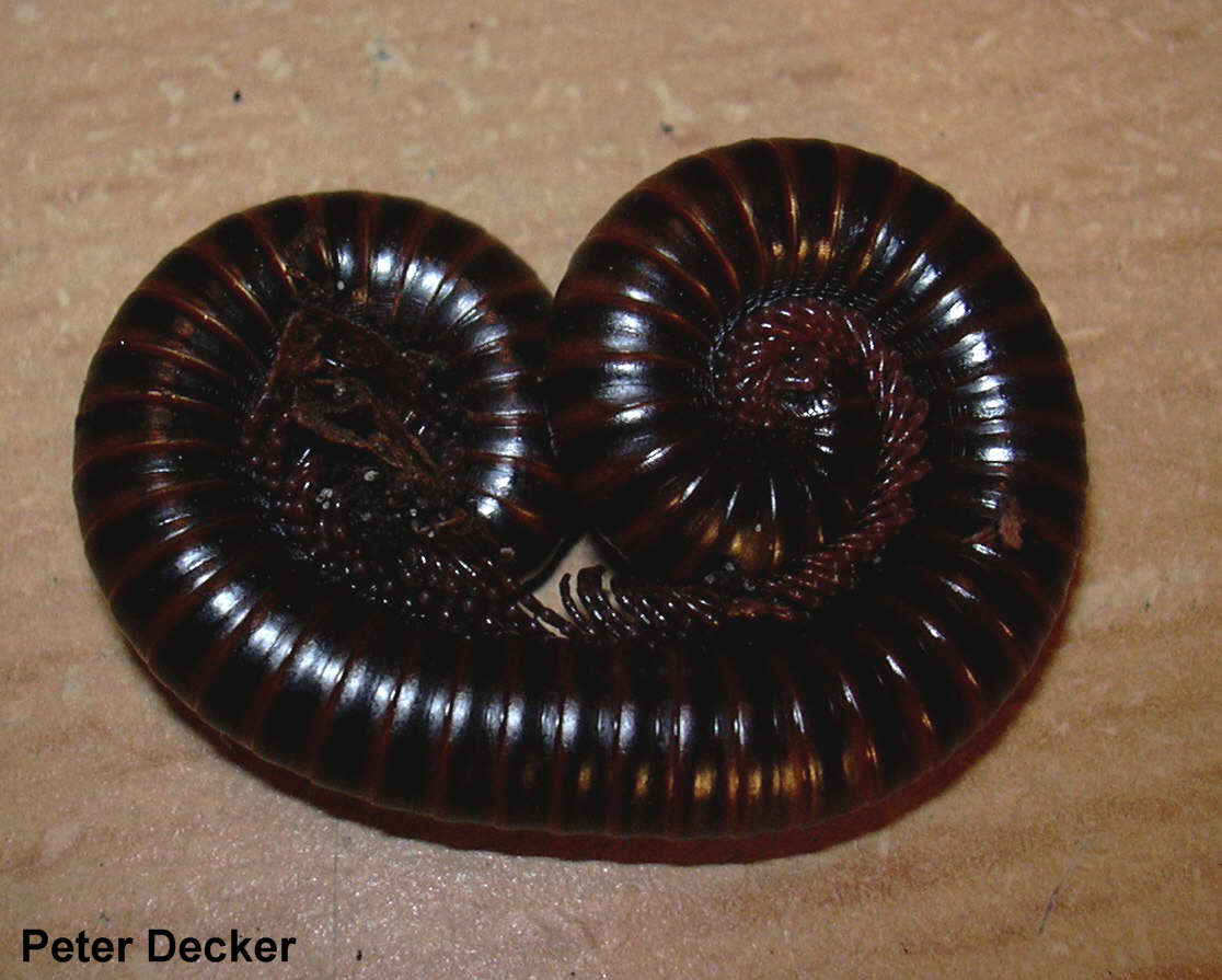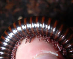 Beschreibung: Mittelgroße schmale glänzende Art. Vorderer Abschnitt der Doppelsegmente (Prozonit) rotbraun, über den Ansätzen der Beinen ein orangfarbener Fleck. Hinterer Abschnitt der Segmente (Metazonit) schwarz mit einem schmalen metallisch rotbraunem Hinterrand. Kopfschild (Collum) dunkelbraun, schmal metallisch rotbraun umrandet. Kopf rotbraun, Analsegment und Analklappen dunkelbraun bis schwarz.